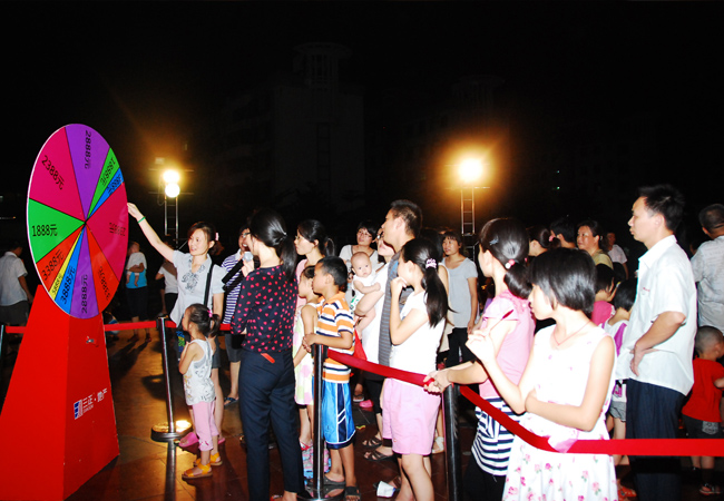 輪到一對(duì)夫妻上場(chǎng)開始搖獎(jiǎng)了,“老婆”首先上場(chǎng)。用力一撥,轉(zhuǎn)盤開始轉(zhuǎn)動(dòng)。“停”,一聲令下,轉(zhuǎn)盤“聽話”地停在了“5888”的位置上。